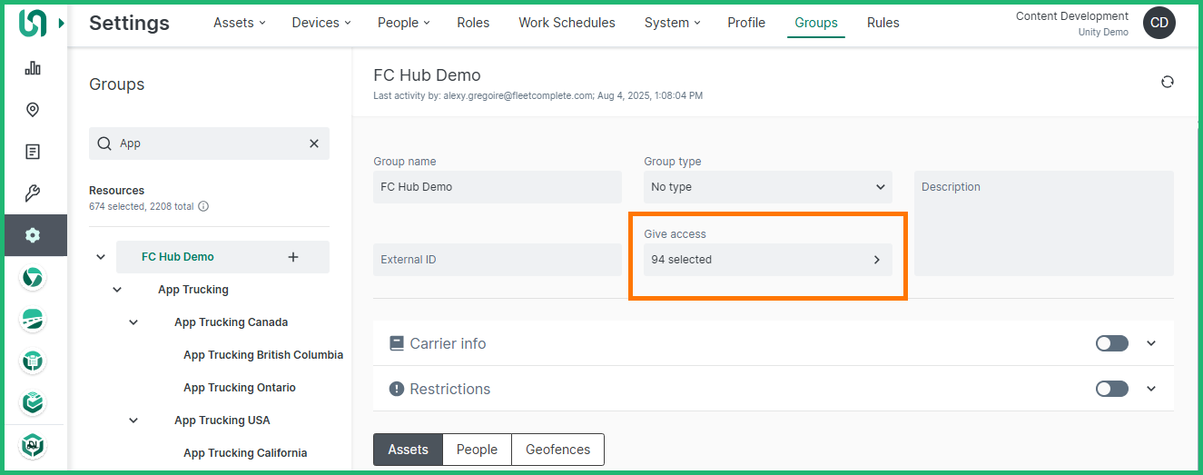 Give Access provides you with the ability to specify the access level of individual users for Groups. Providing them visibility of entities (assets, people and geofences) that belong to the specified Group. Give Access defines if a user can access a Parent or a Child node.