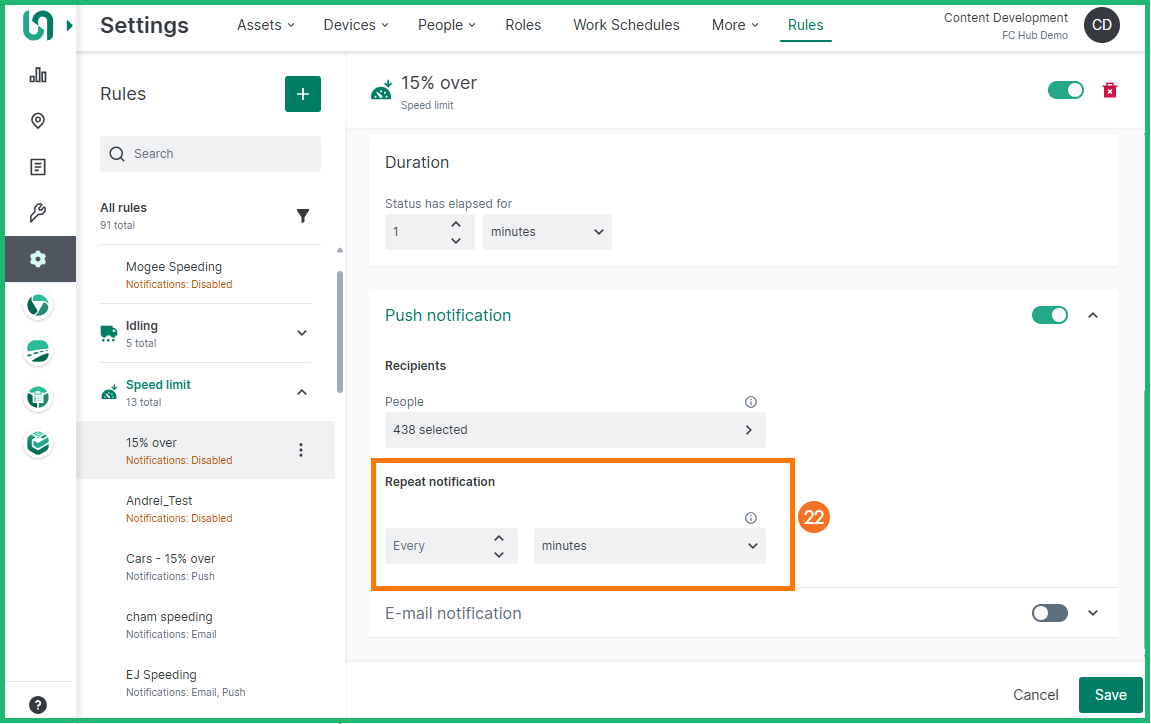 For Push notification, Repeat interval allows you to continue to be notified if the rule continues to be violated based on the specified thresholds.
