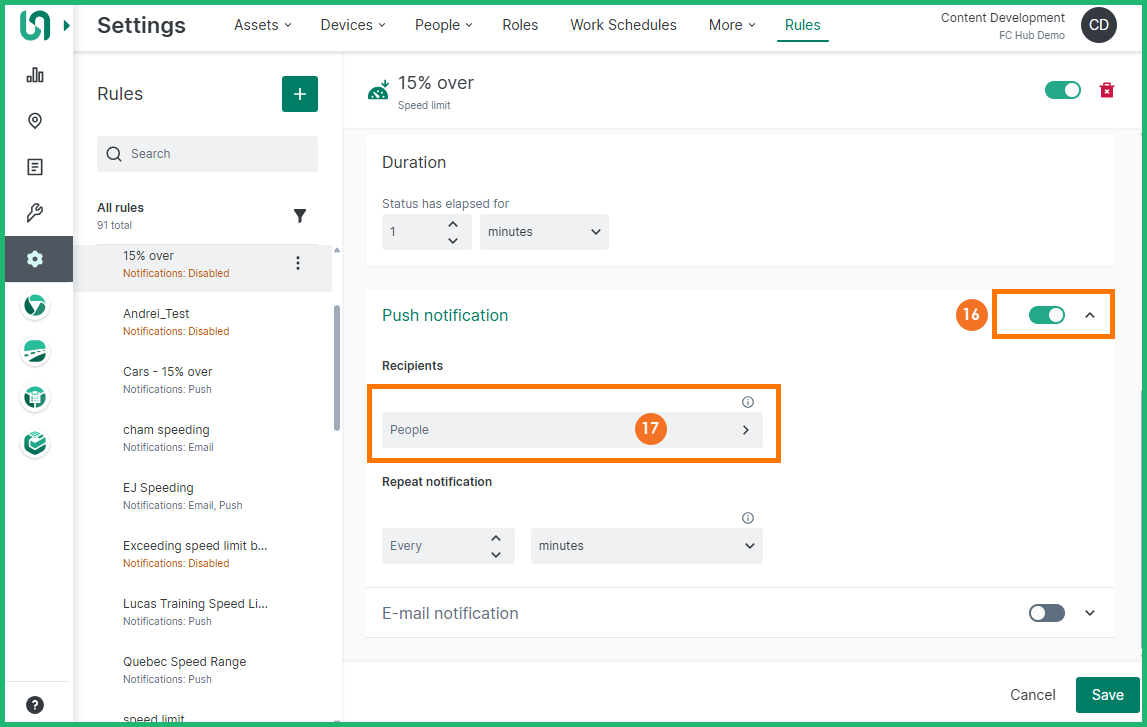 When Push notification is enabled, notifications are sent to the browser and mobile app when the Rule is triggered.