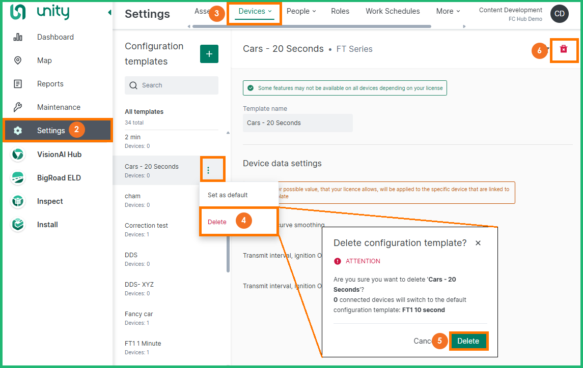 You can delete Configuration Templates from the Unity application. Any devices that were associated with the deleted Configuration Template will switch to the default configuration template for the same device type.