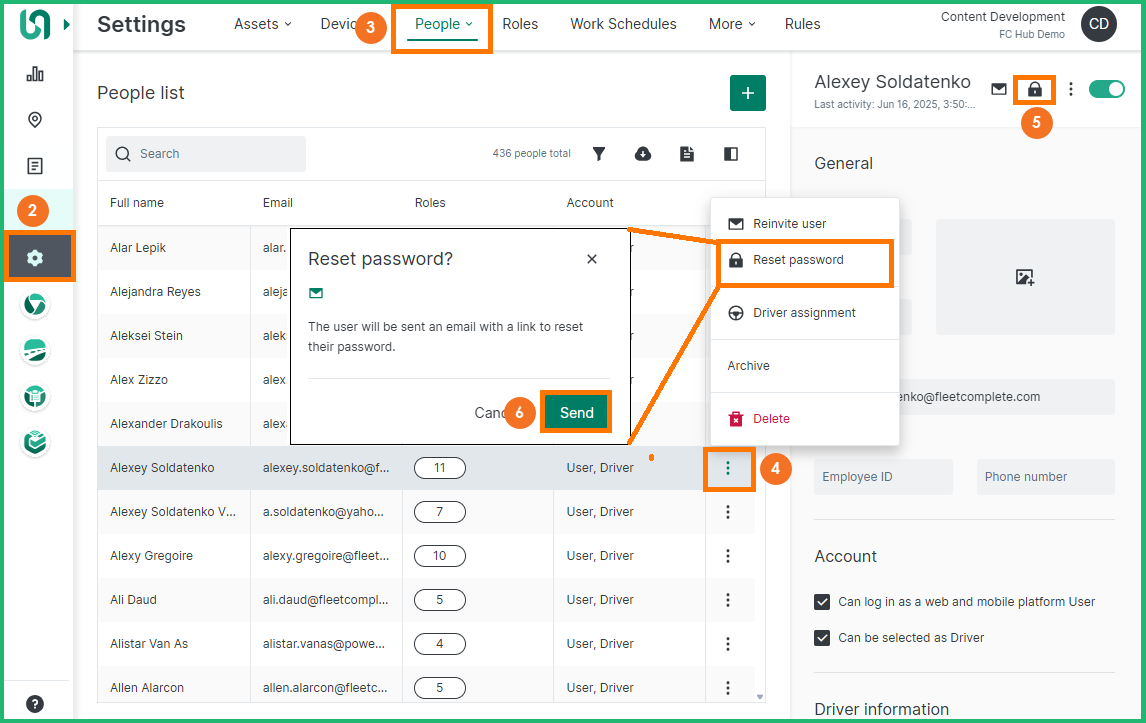 From the People list page, you can request to reset a password for a user. The system will auto-generate an email with a link for the user to reset their password.
