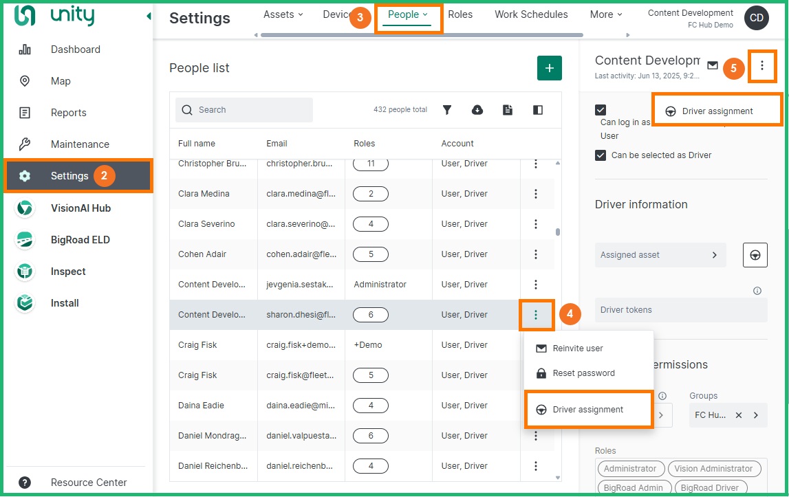 From the People List locate and click the desired user name, and click the 3-dots menu at the end of the desired user row and select Driver assignment