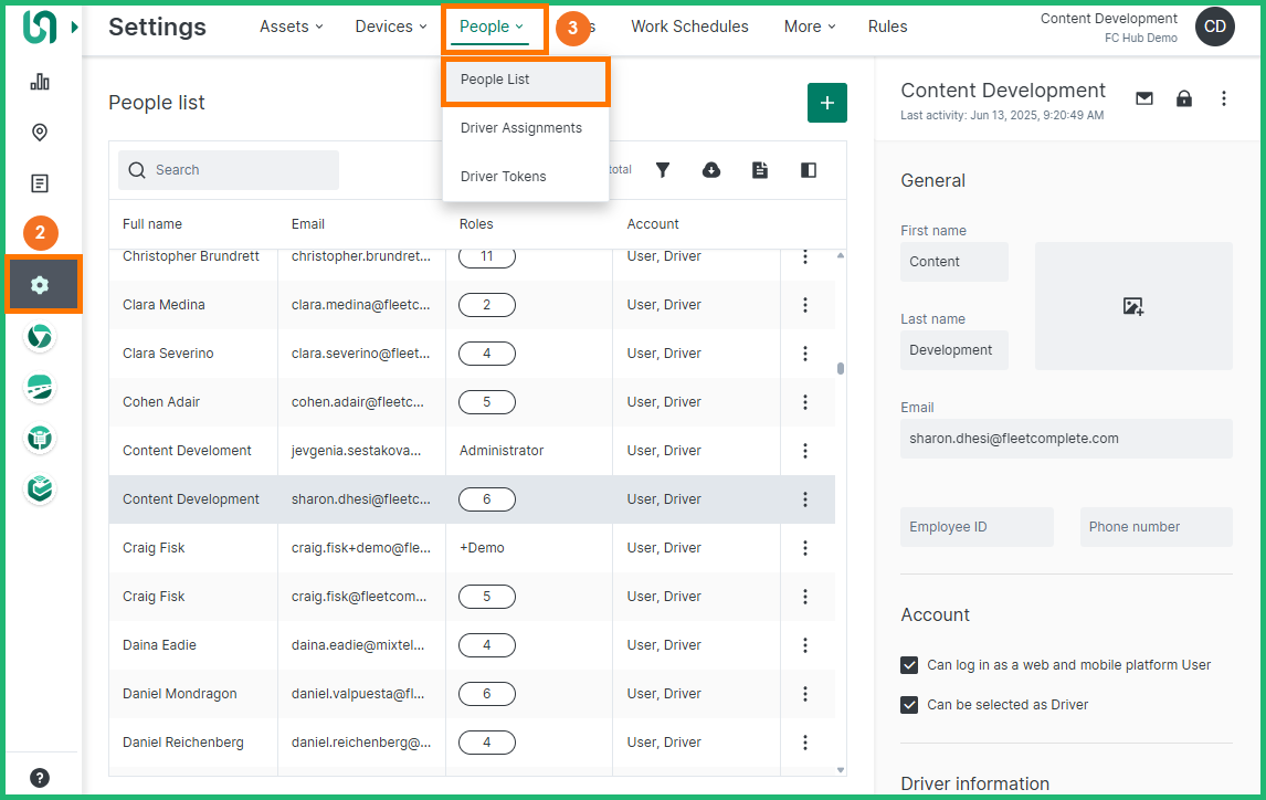 The People List page is accessible from the People tab located in the Settings Module. It allows you to create accounts for your users and drivers.