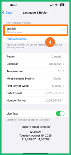 - View the Preferred Languages section and add Language or update to French or Spanish