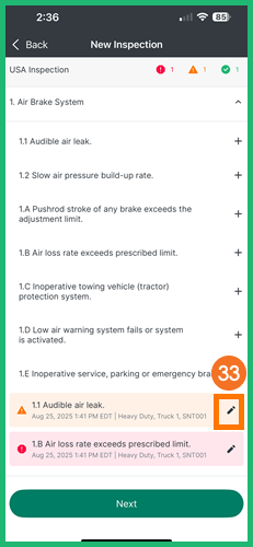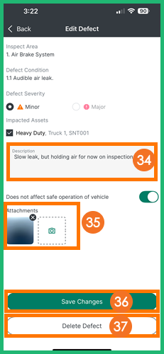 - Navigate to the New Inspection screen, and tap the pencil icon next to the appropriate defect