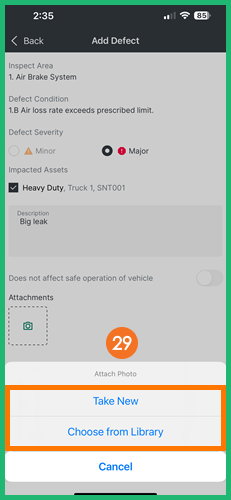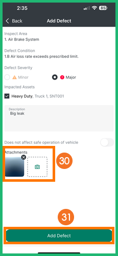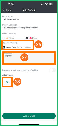 Note: If enabled by the fleet administrator, a photo of the defect may be required (a message will appear that at least one photo is required).