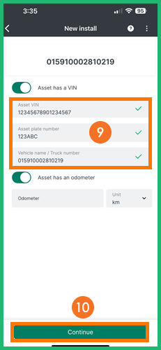 Type in the Asset VIN 17-alphanumeric characters in uppercase, Asset License plate number and Vehicle Name/Truck Number