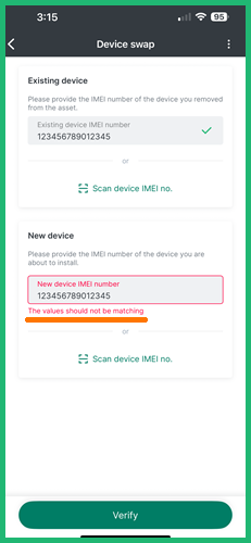 The values should not be matching: the same IMEI number has been entered in both existing and new IMEI number fields.
