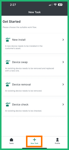 The New Task button contains multiple workflows that installers can choose from including the following: