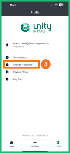 The Profile module allows you to change your Password, and Log Out of the Unity Install mobile app. It also gives you access to Troubleshoot documents.