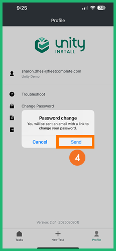- From the pop-up window tap Send, you will be sent an email with a link to change your password