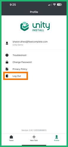 To log out of the Unity Install app, from the Profile module, tap Log Out.