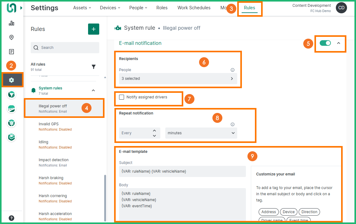 From the E-mail template section, to select additional rule tags to be added to the email notification, place the cursor in the email subject or body and click on the desired tag