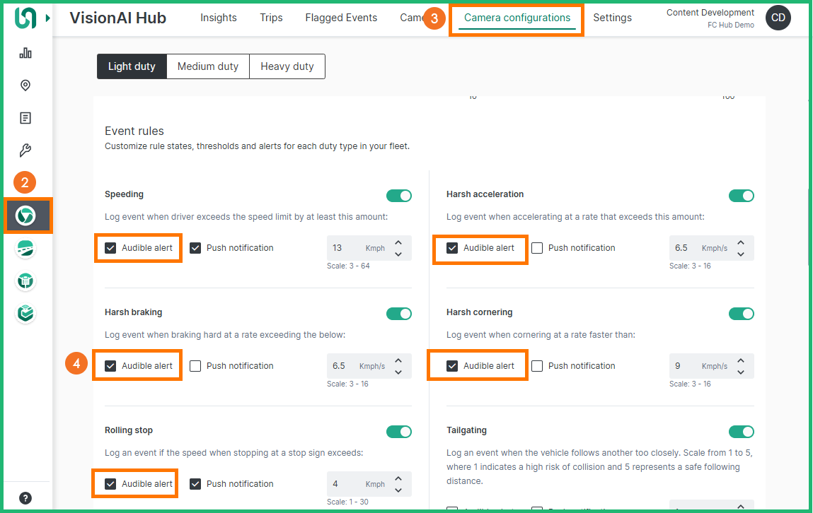 From the preferred Duty Type (Light duty, Medium duty, Heavy duty) check the box next to each event type Audible alert to enable or uncheck to disable audio alerts when triggered