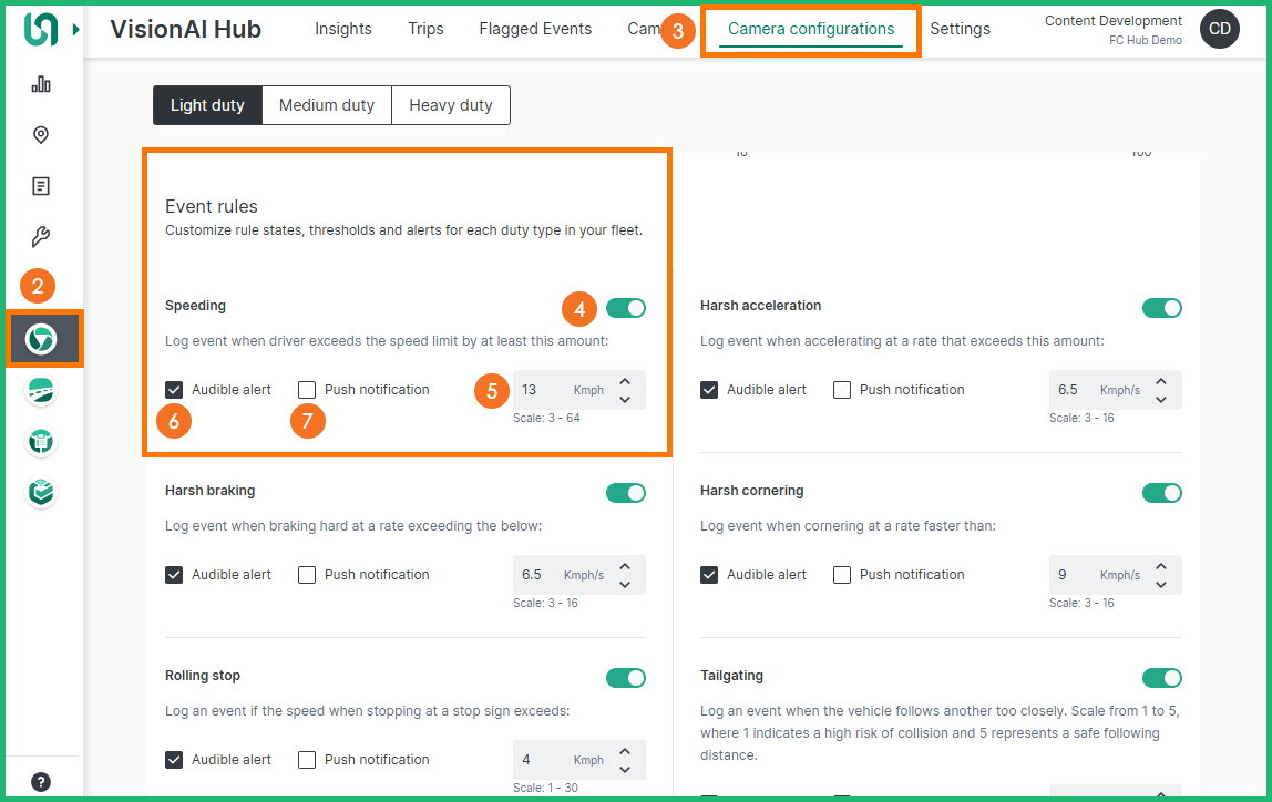 You can customize the thresholds for the following Event Rules: speeding, harsh braking, rolling stop, harsh acceleration, harsh cornering, tailgating. VisionAI Hub will display an industry standard threshold for other AI events.