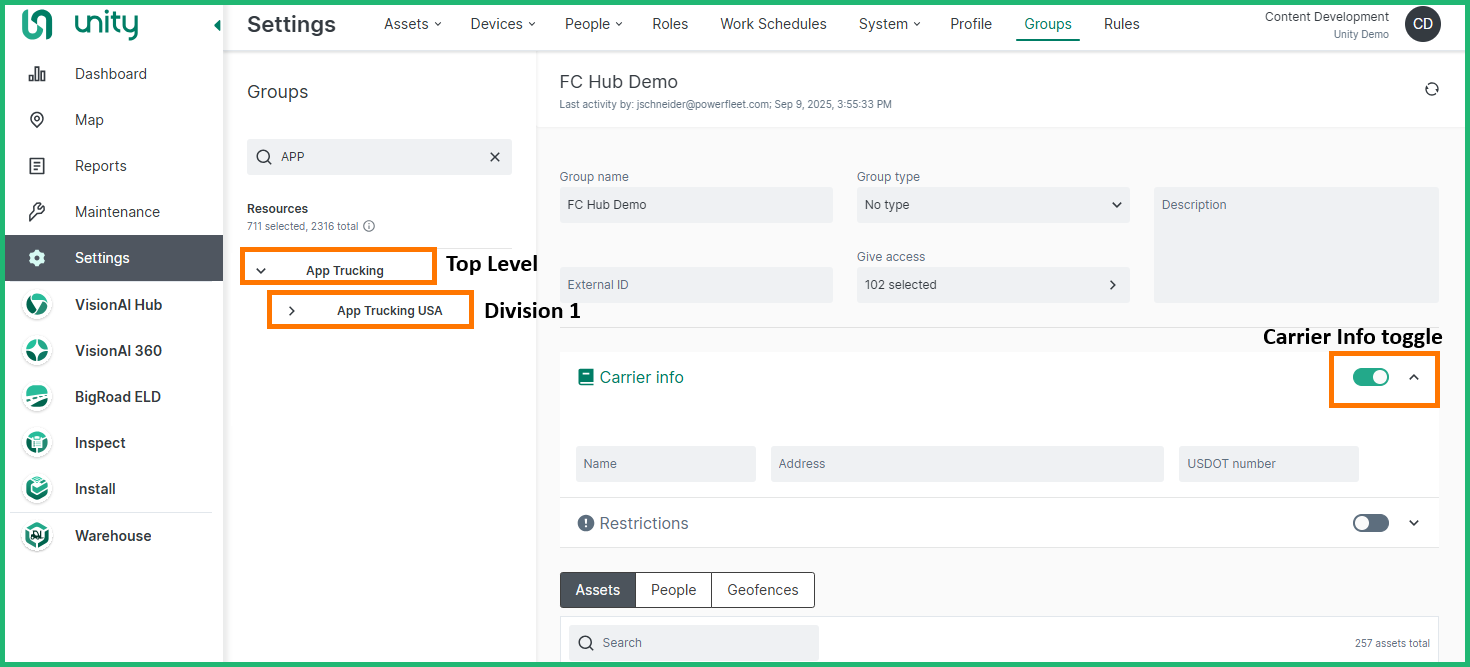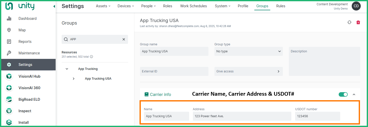 Selecting the correct carrier information for a driver can now be handled much more seamlessly with Unity Groups. You can enter each of the separate carriers as a Group within Unity. In the below example, the top level organization is called APP Trucking. App Trucking is set up with a division in the USA that has the Carrier info toggle enabled and the Carrier info entered.