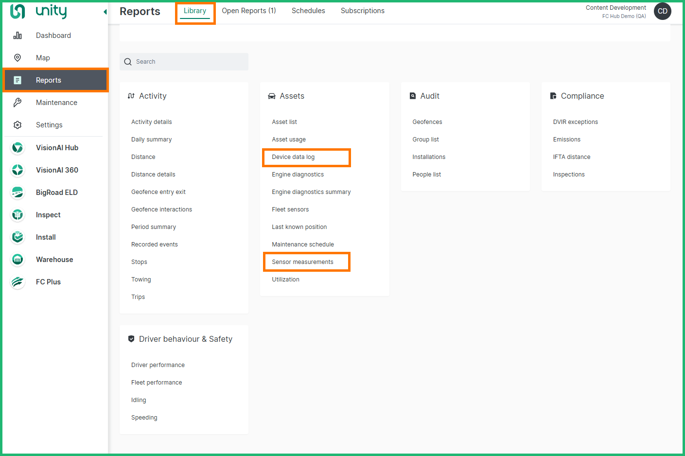 The Device Data Log and Sensor Measurements are located within the Assets category.