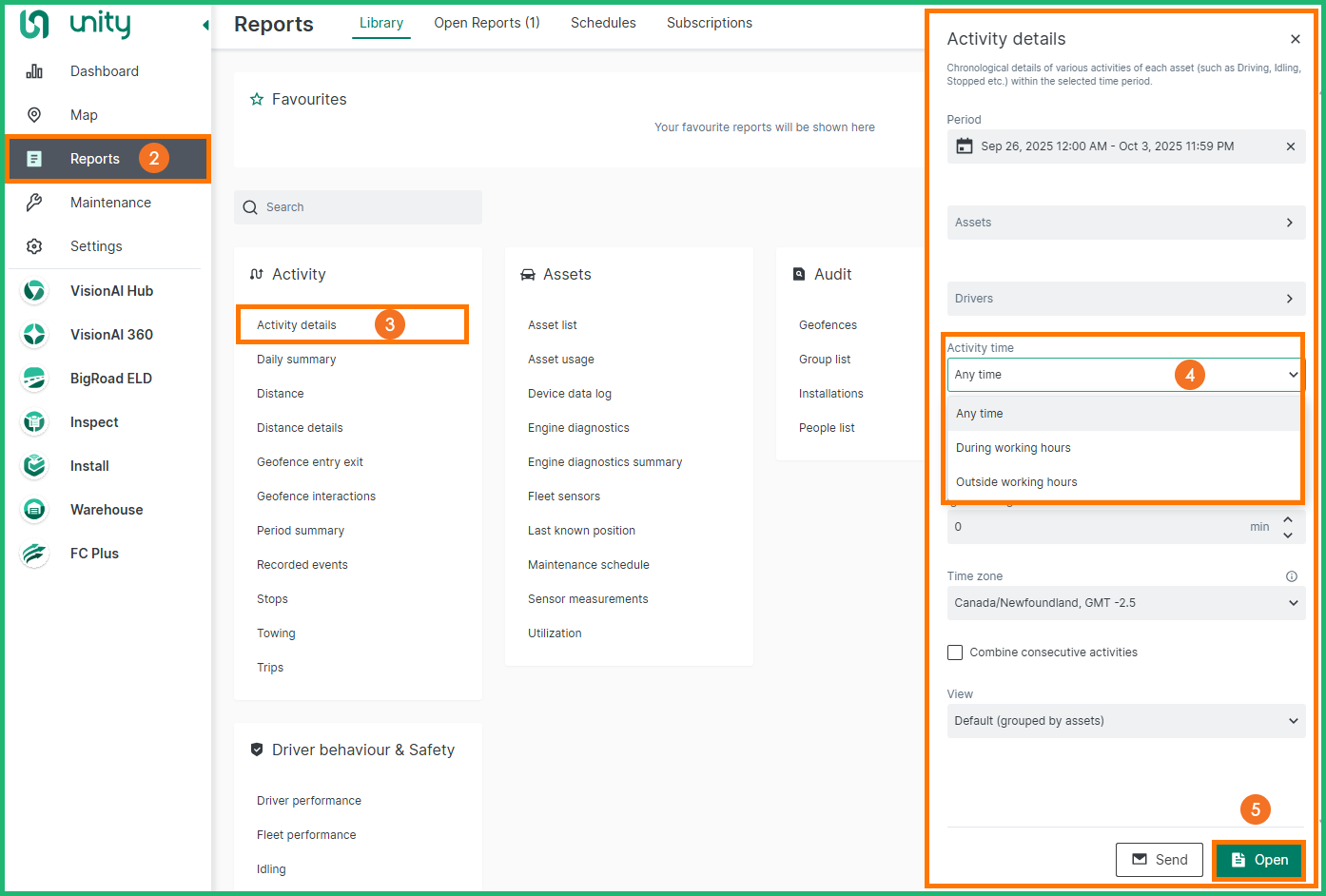 From the Reports Library tab, withing the Activity category, select the Activity Details report