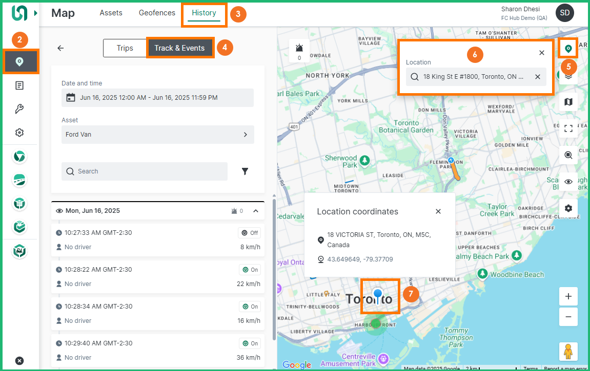 Users can now search for specific locations within the History map. Once a location is selected, a dedicated pin marks it on the map. This helps users verify whether a driver or asset visited a particular place.