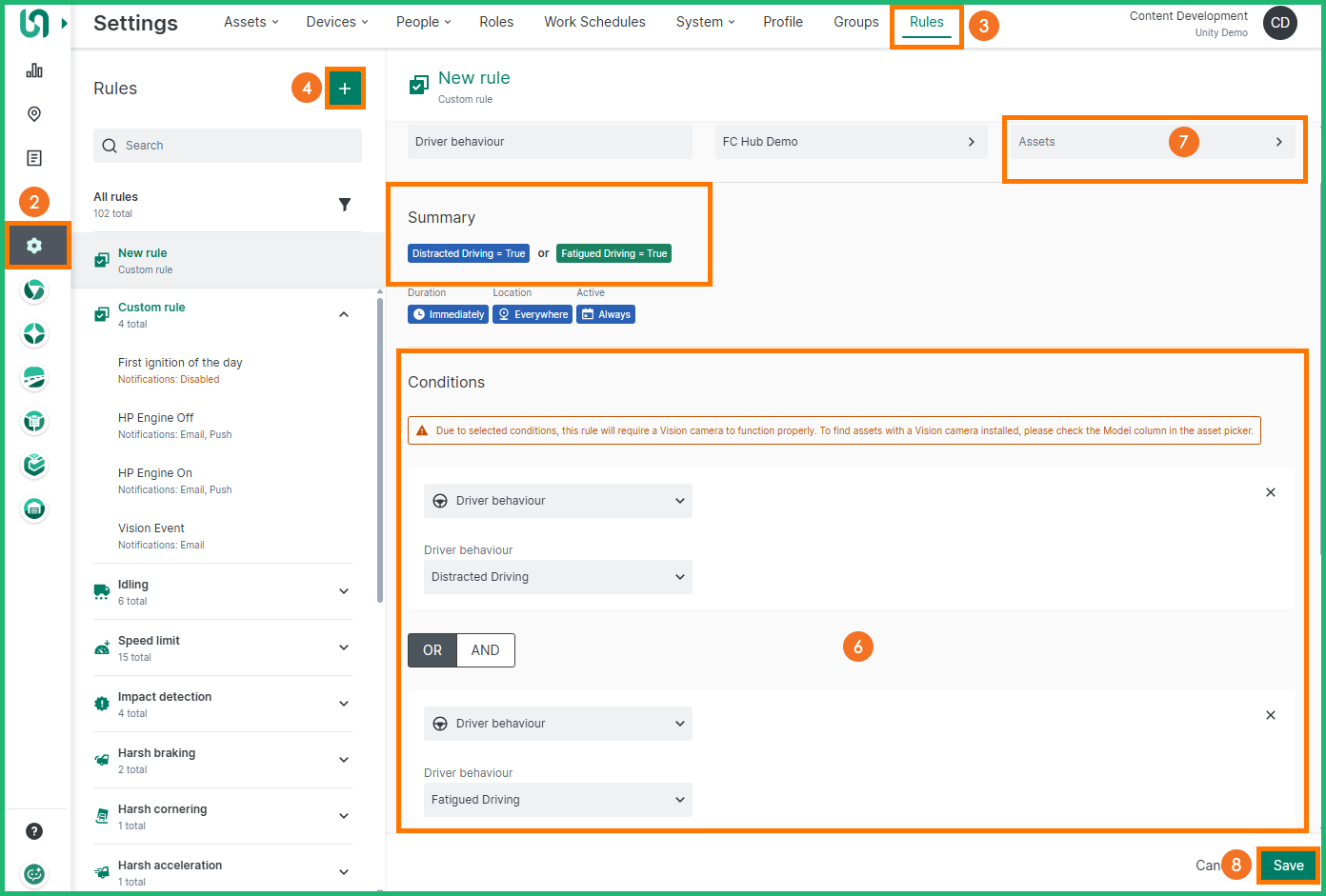 Select the Driver behaviour rule condition and select the desired parameter, use the AND / OR buttons to add additional conditions