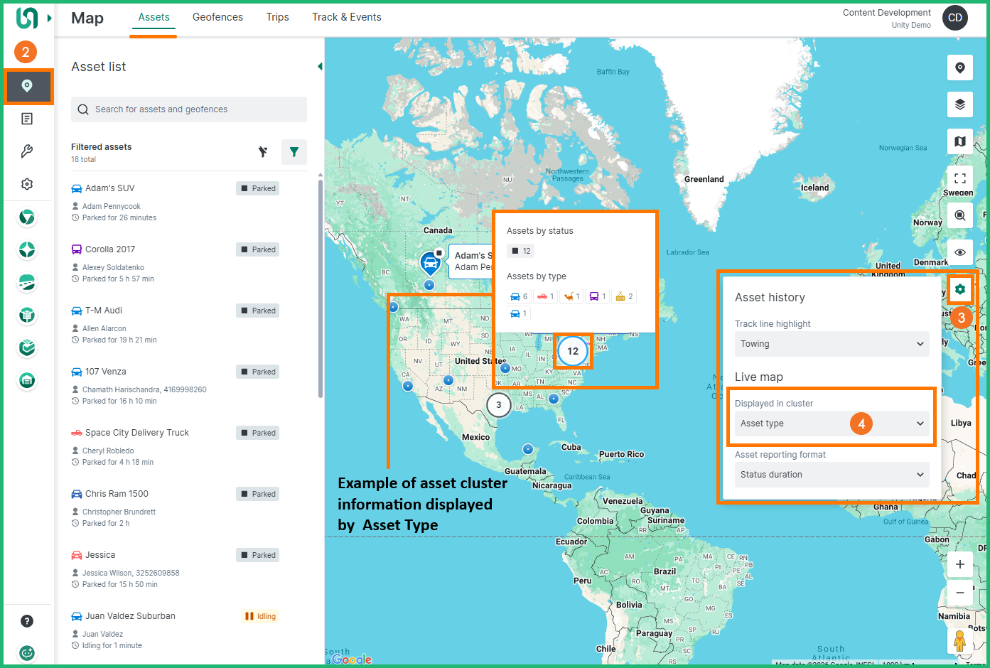 When a specific asset is selected, it’s automatically removed from the cluster and shown individually on the map—regardless of zoom level or map settings—so it always stays in focus. Follow the steps below to access asset cluster layouts: