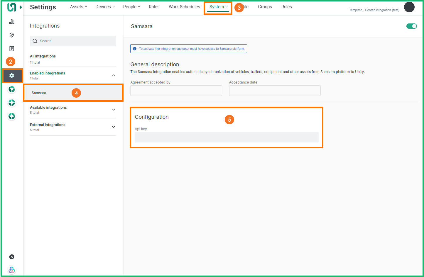 From the Integrations page, click click Enabled Integrations section and select Samsara