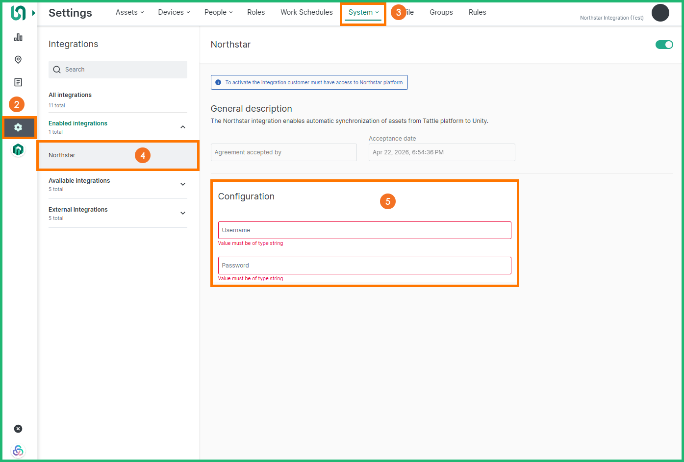 | Integrations Page — Enable Northstar Connector | Go to the Unity FC Integrations page, select Northstar Systems, enter the required API credentials, and enable the connector—ensuring it activates successfully without errors. |